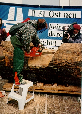 Vor dem Regierungspräsidium wurde der Baumstamm in einer Kunstperformance