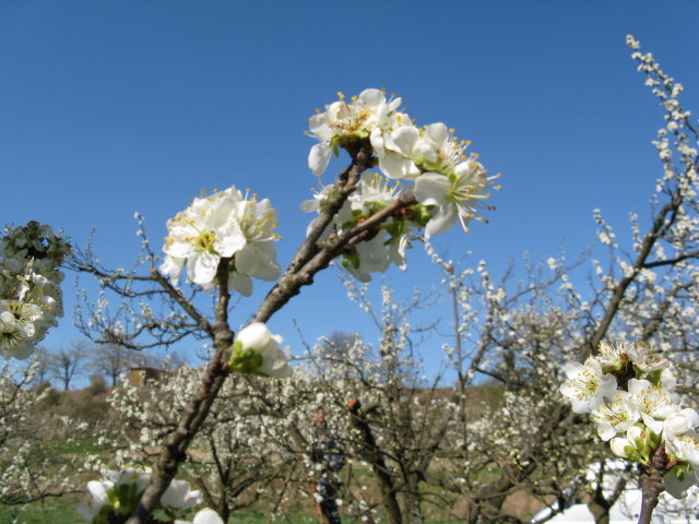Um Amolten und dort besonders im geschützten Tal zwischen Amoltern und Königschaffhausen wachsen viele Obstbäume. Zwetschen lassen sich noch in der Blüte schneiden: Rolf und Edwin Isele, Dorfstr. 26, Amoltern