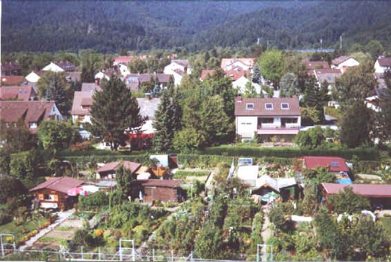 Schrebergärten gibts noch. Links Laubenhof-Altersheim. Rechts