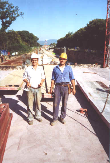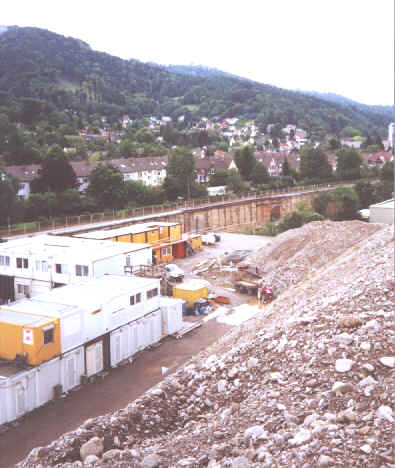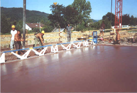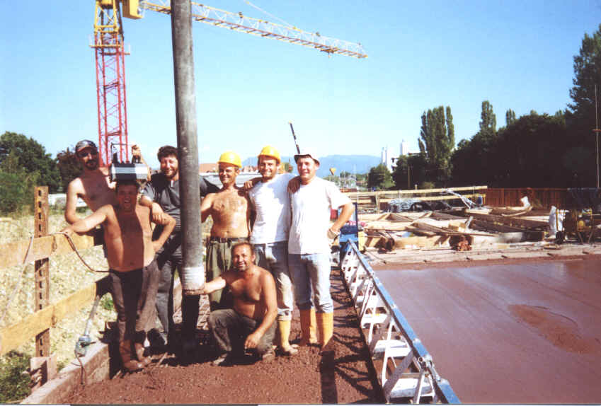 Team at the Schalwagen in Littenweiler The concrete-constructing team from Romania consists of about 15 people - mostly carpenters. They come from Brasow, a town with 400.000 inhabitants about 160 km from Bukarest. They work for the BRAVKOF-Company. Capo ist Mr. Marin Gheorgue. Das Betonbauer-Team aus Rumänien besteht aus ungefähr 15 Leuten - zumeist gelernte Zimmerleute.