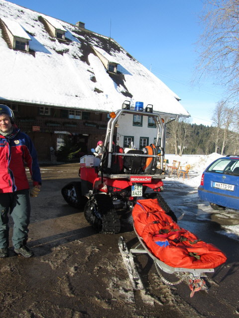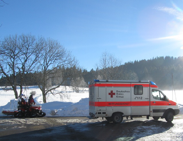 Am 31.12.2010 um die Mittagszeit wird der DRK-Rettungsdienst zu Mathislehof nach Hinterzarten-Oberzarten gerufen: Eine Frau ist am Mathisleweiher gestürzt und muß dort abgeholt werden. Der rettungswagen muß kurz hinter dem Mathislehof umkehren - bei Schnee und Eis ist kein Durchkommen möglich. Nun wird die Bergwacht vom Mathislehof angerufen, schon nach 10 Minuten ist sie da. Mit einem umgebauten Allrad-Quad (Raupen ersetzen die Räder, Überrollbügel) und Sanka-Anhänger auf Schlittenkufen kommt sie zum tief verschneiten Mathisleweiher durch, um die verunglückte Frau warm eingepackt zum Rettungsfahrzeig am Mathislehof zu bringen.