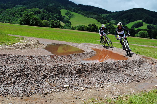 Die beiden Lexware-Fahrer Florian Strecker und Martin Gluth testeten bereits die eigens angelegte Sprintstrecke, die nach der Veranstaltung wieder rekultiviert wird. Foto: Gerhard Lück
