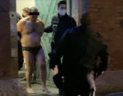 Polizisten führen den S-Bahn-Stoßer aus der Wache. Seine Kleidung wurde von der Spurensicherung konfisziert. Anschließend wird er ins Polizeipräsidium gebracht