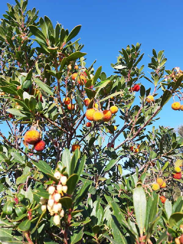 Arbouse – ein pelziges Zwischending von Kirsche und Stachelbeere – wachsen wild, schmecken herb und wirken darmreinigend – zuviel auf einmal essen ist gefährlich für pf…… Tolle Marmelade. An den 2-3 m hohen Büschen kann man zur gleichen Zeit rote Früchte und weiße Blüten bewundern.