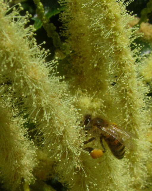Zurück zu den Bienen im Kastanienbaum: Diese so nützlichen Tiere juckt das menschliche Tagesgeschehen nicht. Sie sind fleißig unterwegs von Blüte zu Blüte, um die begehrte Nahrung in die gelben Fußtaschen am Bein (siehe Bild) zu sammeln. Solange die Bienen fliegen, ist die Natur noch in Ordnung.