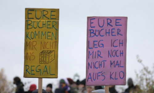 Verglichen mit dem, was dort sonst zu hören war, darf man beiden Aussagen eine gewisse Komplexität bescheinigen. Fragt sich nur, warum Menschen zu einer Buchmesse, aber nicht hinein gehen, sondern davor stehenbleiben und kundtun, dass sie die Bücher, die drinnen verkauft werden (und die sie nicht kennen, geschweige gelesen haben), niemals in ihr Regal stellen würden. Ich gehe doch nicht zu einem Konzert von, sagen wir, Herbert Grönemeyer, und halte dort ein Plakat hoch, auf dem geschrieben steht, dass ich nie zu einem Konzert von Herbert Grönemeyer gehen noch mir je eine Platte von ihm zulegen würde.