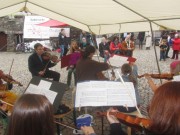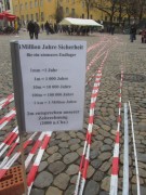 Das Alter der Menschheit wird auf 1 Million Jahre geschätzt. Für ein atomares Endlager wird deshalb 1 Million Jahre Sicherheit gefordert. 2012 hat die Mahnwache zum 1. Jahr nach Fukushima am Augustinerplatz in Freiburg die Million mit 1000 Teelichtern und 1000 Grablichten veranschaulicht. In diesem Jahr am 10./11.3.2013 soll dies metrisch dargestellt werden: 1 Jahr für einen Millimeter, 1 Million Jahre für einen Kilometer, dieser km soll als Weg in Zick-Zack Linien ausgelegt und somit auch begehbar sein. Unterm Zeltdach spielte das Kinder- und Jugendorchester der Geigenlehrerin Regine Kilian. Die Worte zu Schweigeminute von Michael Ernst machten schon nachdenlich. Und auch zum Nachdenken: Eine Japanerin aus Kobe, die zufällig vobei kam, war so gerührt, dass Tränen flossen.