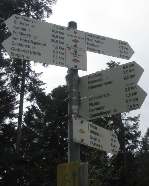 Streckereck am 1.5.2012: Blick nach Süden zum Wegweiser auf 727 m Höhe