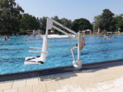 – Barrierefreiheit. Rollstuhllifter (siehe Bild), anders als im Strandbad fest installiert