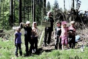 Bildunterschrift: Revierförster Bernhard Friedmann und die Schulanfänger des Waldkindergartens haben einen kleinen „Wildapfel“ gepflanzt – Bild: Anja Scheiner