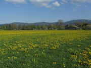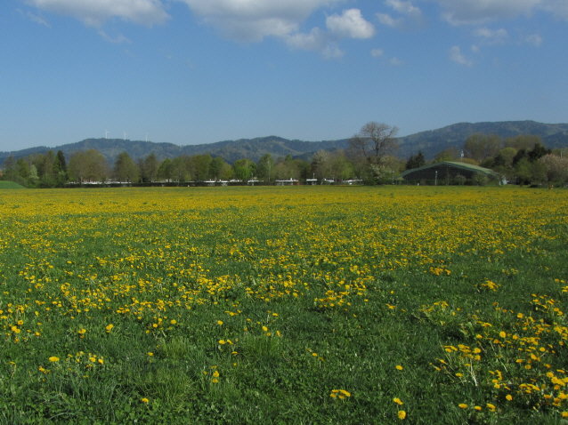 Blick nach Nordwesten über blühenden Löwenzahn zum Camping Kirchzarten sowie den Rosskopf-Windrädern am 15.4.2011