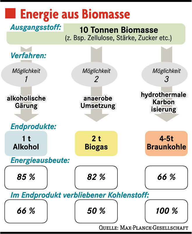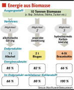Besonders attraktiv wird die Hydrothermale Karbonisierung dadurch, dass das Verfahren nicht nur Zucker, sondern auch pflanzliche Bioabfälle in eine brennbare Energiequelle verwandeln kann. 70 Prozent der in der kompletten Pflanze gespeicherten Energie ließen sich auf diese Weise nutzen, ist am Max-Planck-Institut zu erfahren. Eine Quote, mit der die HTC den Konkurrenzmethoden klar überlegen ist. Bei Biogas sind es nur 41 der Energie, bei Alkoholsprit 56 Prozent. Ein Grund für das schlechte Abschneiden anderer Verwertungsmethoden ist, dass kein Verfahren die Pflanze so komplett ausnutzt. Bei der in Brasilien üblichen Kraftstoffherstellung aus Zuck errohr zum Beispiel, sind nur 15 Prozent der Pflanze in der Lage zu gären und damit Alkohol zu bilden. Auf diese Weise gehen aber schon zu Anfang 85 Prozent der in der Pflanze gespeicherten Energie verloren. Die HTC dagegen habe eine neutrale Kohlenstoffbilanz, betont Antonietti. "In unserem Verfahren werden fast hundert Prozent des gebundenen Kohlenstoffs zu Kohle umgewandelt." Aus dieser Kohle kann in weiteren Bearbeitungsschritten wiederum Benzin hergestellt werden. Beim Biodiesel kommt noch ein anderer Nachteil hinzu: "Pro Hektar Land erhält man 3,2 Tonnen Rapssamen, aus denen man eine Tonne Diesel herstellen kann" , erklärt Antonietti. "Mit der HTC lassen sich aus einem Hektar zwanzig Tonnen Kohlenstoff beziehungsweise zehn Tonnen Treibstoff gewinnen." Derk Jan Swider vom Institut für Energiewirtschaft und Rationelle Energieanwendung (IER) in Stuttgart steht der Begeisterung der Kollegen skeptisch gegenüber. Schließlich habe Biomasse nur ungefähr die Hälfte des Heizwerts von Steinkohle, betont er. "Ich glaube nicht, dass ein Zwischenschritt wie die Umwandlung von Biomasse zu Steinkohle die Wirtschaftlichkeit erhöht." Auch müssten die Herstellungskosten der Gewinnung des jeweiligen Energieträgers betrachtet werden. Für eine abschließende Bewertung allerdings lägen ihm zu wenige Informationen vor.