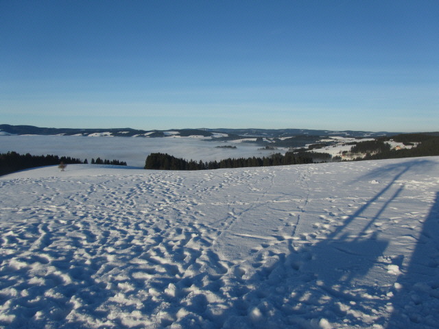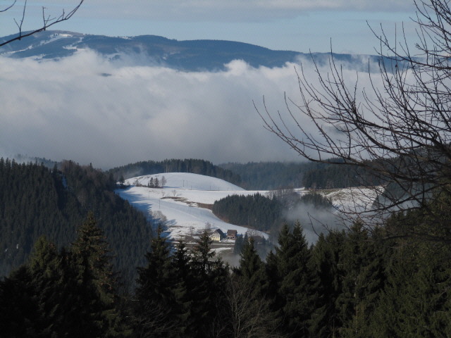 Blick vom Unteren Fahrenberg nach Süden über Breitnau zum Feldberg am 1.1.2011 - Hinterzarte links im Nebel Blick vom Unteren Fahrenberg nach Süden über Breitnau-Tiefen am 1.1.2011 - Hinterzarte links im Nebel