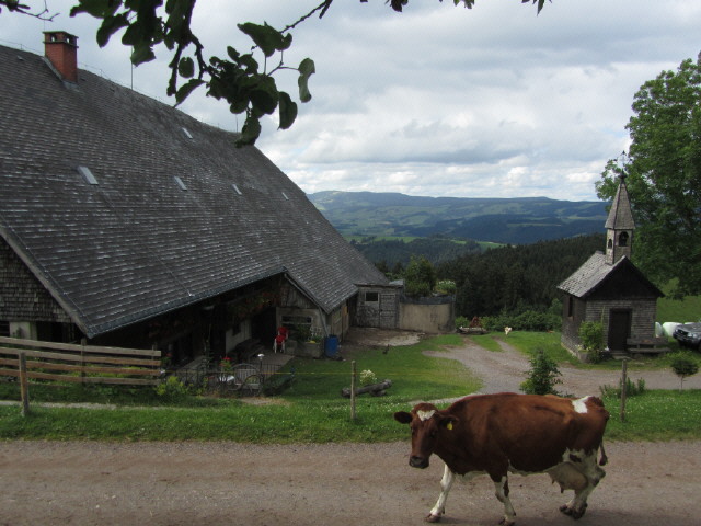 Der alte Beckenhof am Fahrenberg datiert von 1357 und ist der älteste Bauernhof auf der Breitnauer Hochebene. Die großen Eindachgehöfte werden auch Heidenhäuser genannt - sie beherbergen Menschen, Tiere und Erntegut gleichermaßen aufgehoben. Glücklicherweise wurde der alte Beckenhof nach dem Bau des neuen Hofs weder abgerissen noch unfachmännisch "umbau-saniert". Auch im Juli 2011 scheint hier die Welt noch in Ordnung bzw. stehengeblieben zu sein: Ein Paradies für Tiere (die frei herumlaufen) wie für Kinder (die viel zu entdecken haben): Hühner gackern, ein weißer Gockler kräht, ein Pfau schlägt stolz sein Rad, das Kätzchen döst vor sich hin, die Kühe schauen vorbei, Gänse schnattern aufgeregt - und zwischen alledem promeniert eine Muttersau besorgt mit ihren sieben Ferkeln umher.