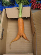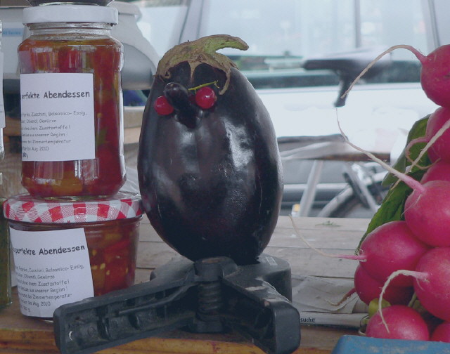Möhren-Twin mit Herz am 22.8.2008 bei Kiener am Münstermarkt Karottenliebe am 14.102008 auf dem Münstermarkt Aubergine mit Johannisbeeraugen am 24.8.2009 auf dem Münstermarkt - Bild: Bertram Schwarz