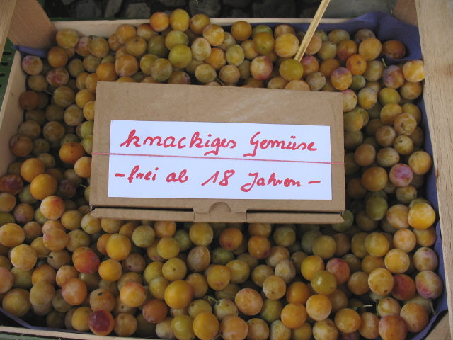 Mirabelle - Zwillinge: Was wohl stellen sie dar? Zwetschgen-Zwillinge am 30.7.2008 bei Kiener auf dem Münstermarkt Zwetschgen-Zwillinge am 30.7.2008 bei Kiener auf dem Münstermarkt - nahe
