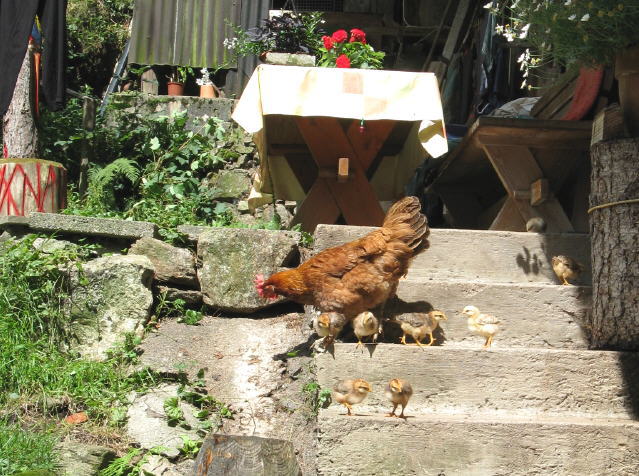 Der stolze Pfau beim Bauernhof der Kartaus im April 2005 Die Glucke mit 9 Jungen bei Lupfers im Kilpen am 13.8.2008 - links der Treppe EM und rechts VS Glückliche Hühner am Sutter-Hof in Gersbach am 21.2.2010