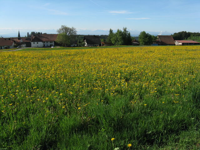 Blick von Buggenried nach Südenüber den Maier-Hof  zur Alpenkette am 17.5.2009 Blick nach Norden zum Gasthaus zum Kreuz in Buggenried am 17,.5.2009 Tele-Blick von Buggenried nach Süden zur Alpenkette am 17.5.2009 - Löwenzahn