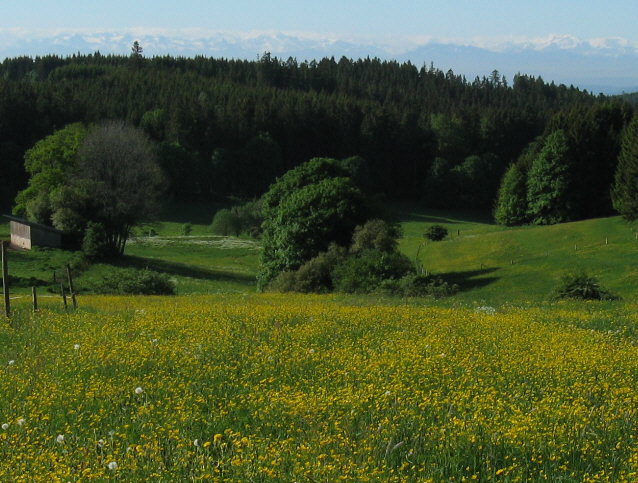 Blick nach Süden über Buggenried zu den Alpen am 17.5.2009 - Löwenzahn überall