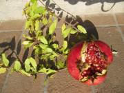 Botanik des Granatapfels: Eine einzigartige Frucht, ohne Verwandtschaft zu anderen Pflanzen. Er hat. 10 cm lange glänzende Blätter und wird  5 - 8 m hoch. Röhrenförmige, orangefarbene Blüten. In der kugel- bzw. apfelförmigen Frucht sind viele viele Beeren enthalten, die süß-sauer und erfrischend schmecken - mit großen weißen Kernen, die man ruhig mitessen kann (Ballaststoffe).