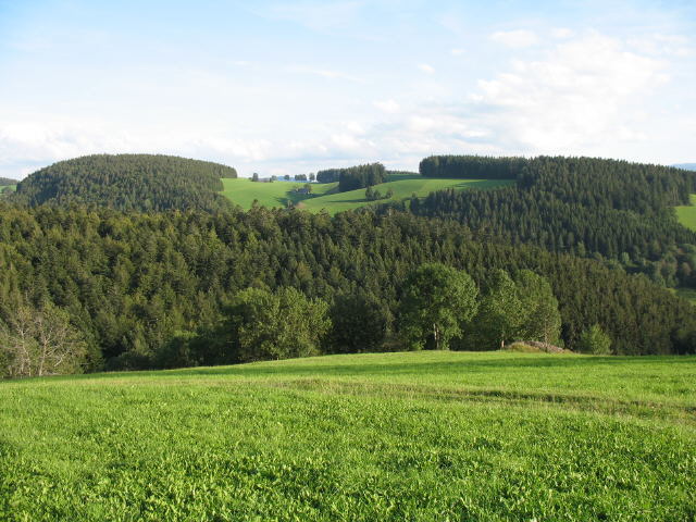 Oder von St.Peter das kleine Sträßchen "Schmittenbach" nach Norden hoch in Richtung Platte und Schönhöfe. Oben beim Abzweig zum "Vorderen Willmen" den Ausblick genießen. Dann links über den den Höhenweg auf dem Vorderen Willmen zu "Auf der Eck" und weiter zum Heitzmannsberg.