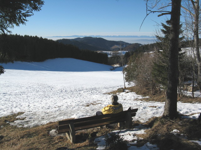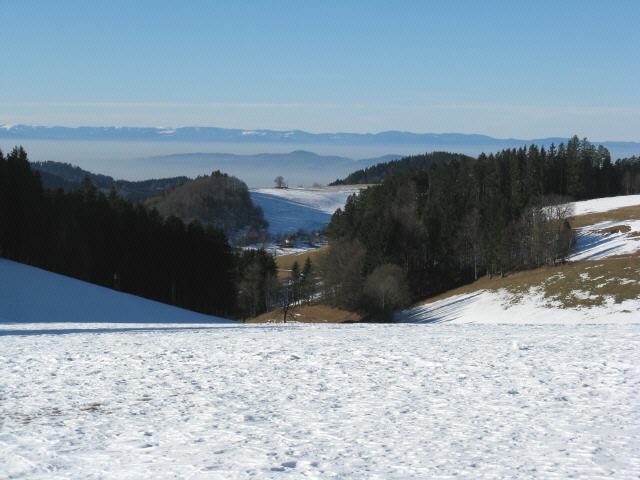 Blick von "Auf der Eck" nach Norden über das Untere Steigrubenhäusle zu Brulenz (rechts) zum Kandel am 12.1.2009 Blick von "Auf der Eck" ob St. Peter nach Süden über den Lindenberg zum Schauinsland am 12.1.2009 Blick von "Auf der Eck" ob St. Peter nach Westen über die Windräder auf dem Rosskopf zu den Vogesen am 12.1.2009
