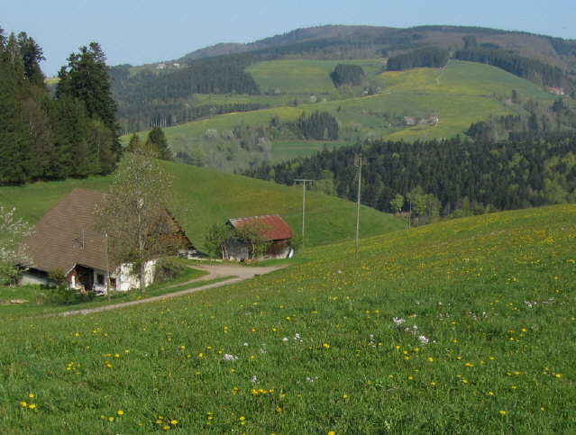 Blick von "Auf der Eck" nach Westen über das Obere Steigrubenhäusle zu den Vogesen am 12.1.2009 Tele-Blick von "Auf der Eck" bei St.Peter nach Süden über Oberibental, Zwerisberg und Spirzen  zum Fahrenberg ob Breitnau am 7.5.2009 Blick von "Auf der Eck" nach Süden zu Oberibental und St.Peter zum Lindenberg (rechts) am 7.5.2009 - Löwenzahn