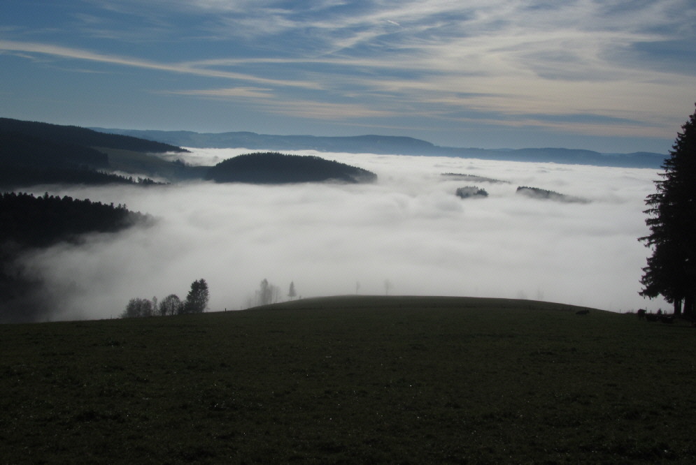 Blick nach Westen über den Vorderen Willmen zum Heitzmannsberg (Mitte) und Kandel (rechts) am 18.9.2004 Blick nah Westen zum Vorderen Willmenhof am 1.2.2004 Blick nach Westen am 5.12.2004 über den Willmendobel zu "Auf der Eck" (links), Heitzmannsberg (Mitte) und Kandel (rechts) - Nebel im Sägendobel