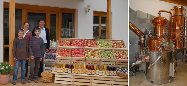 Der „Markenhof“ in Burg am Wald expandiert. Ende des Monats eröffnet die Familie Miedtke ihren Hofladen in einem neuen Betriebsgebäude, das nach einjähriger Bauzeit jetzt fertig gestellt wurde. Neben dem Hofladen beherbergt das neue Haus eine Obstbrennerei, einen Weinkeller und eine Sortierhalle. Die im Keller untergebrachte Hackschnitzelheizung versorgt sämtliche Gebäude des Markenhofes mit Wärme. Bisher gab es auf dem Markenhof für den Verkauf der eigenen Produkte nur eine Selbstbedienungstheke. Im hellen und geräumigen neuen Hofladen kann die Familie Miedtke jetzt die gesamte Palette der eigenen Produkte aus Obstbau und Fruchtsaftkelterei kundenfreundlich anbieten. Dazu gehören Äpfel, Birnen, Steinobst, Beerenobst und Kartoffeln. In der hofeigenen Kelterei stellt Uwe Miedtke, der promovierter Agraringenieur ist, verschiedene Säfte wie Apfel-, Birnen-, Apfel-Holunder- und Apfel-Sauerkirschsaft sowie Apfelwein her. In der neuen Obstbrennerei destillieren Miedtkes eigens dafür angebaute Früchte wie Williamsbirnen, Löhrpflaumen, Mirabellen und Kirschen zu aromatischen Bränden. Da die Brennerei nur mit einer großen Glasscheibe vom Hofladen getrennt ist, können die Kunden dem Brennmeister beim Handwerk zuschauen. Die unterschiedlichen Schnäpse sind im Laden zu probieren und zu kaufen. Verschiedene Konfitüren und Sirups runden das Angebot eigener Produkte ab. Das Sortiment des Hofladens wird durch den Zukauf von heimischem Gemüse, Bauernbrot, Käse und Mühlenprodukten erweitert. Der „Markenhof“ ist ein Sonderkulturbetrieb für Obst mit eigener Fruchtsaftkellerei. Auf einer Fläche von 5,5 Hektar baut Uwe Miedtke Äpfel, Birnen, Zwetschgen, Mirabellen und Kirschen sowie auf weiteren 0,7 Hektar Kartoffeln an. Um bei optimaler Belichtung gut gefärbte wohlschmeckende Früchte zu produzieren, sind auf jedem Hektar etwa 2.500 kleinkronige Bäume gepflanzt. Das gute Klima im Dreisamtal mit viel Sonne und deutlicher nächtlicher Abkühlung hilft ebenfalls zu einer guten Ernte. Auf den Wochenmärkten in Kirchzarten und Littenweiler wird der Markenhof auch zukünftig vertreten sein.
