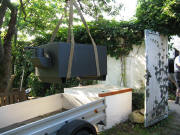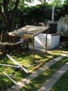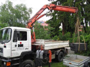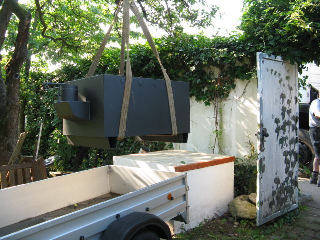 Der Holzbackofen DB 85-60, 450 kg schwer, wurde am 5.5.2010 in Aderstedt abgeholt. Nun wird er in Freiburg im Garten eingebaut und Ende Mai in Betrieb genommen: Er zieht gut, brennt ausgezeichnet und backt zu aller Zufriedenheit.