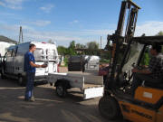 Holzbackofen auf Anhänger verladen zum 700 km Transport von Aderstedt nach Freiburg Holzbacköfen DB 85-60, DB 75-50 sowie ID 75-50 (von rechts)