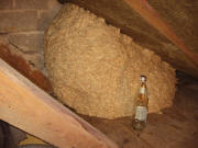 Gewaltig ist dieses Wespenenst in Siensbach: 60 mal 80 mal 40 Zentimeter misst das "Kunstwerk" unter dem Dach eines älteren Hauses. Im Sommer schwirrte es dort kräftig, so die Bewohner Martina und Reinhard Heizmann, die dennoch den Wespen ihren Lebensraum ließen. Nun im Winter lässt sich das Nest im Speicher des Brennerhofs gefahrlos fotografieren.