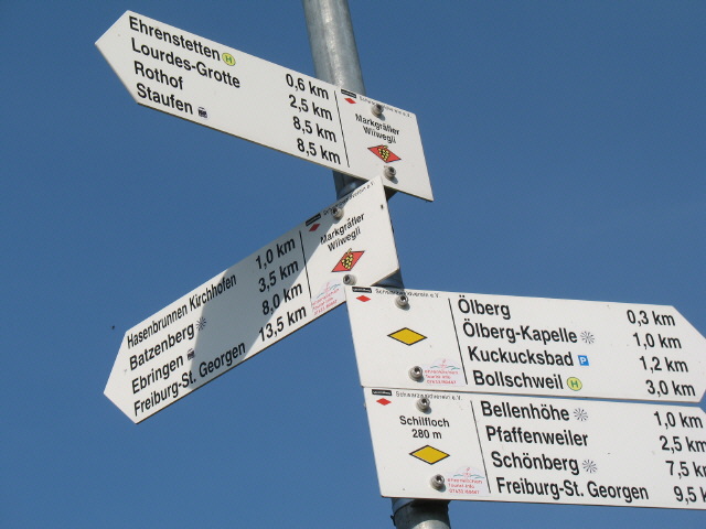 Wiiwegli-Wegweiser "Schiffloch" beim Habrunnen nördlich Kirchhofen Blick vom Südhang der Bellenhöhe nach Nordosten zum Ölberg am 10.11.2006 Blick vom Südhang der Bellenhöhe nach Osten zum Ölberg und Kapelle (rechts) am 10.11.2006