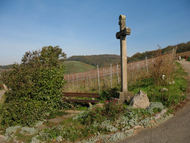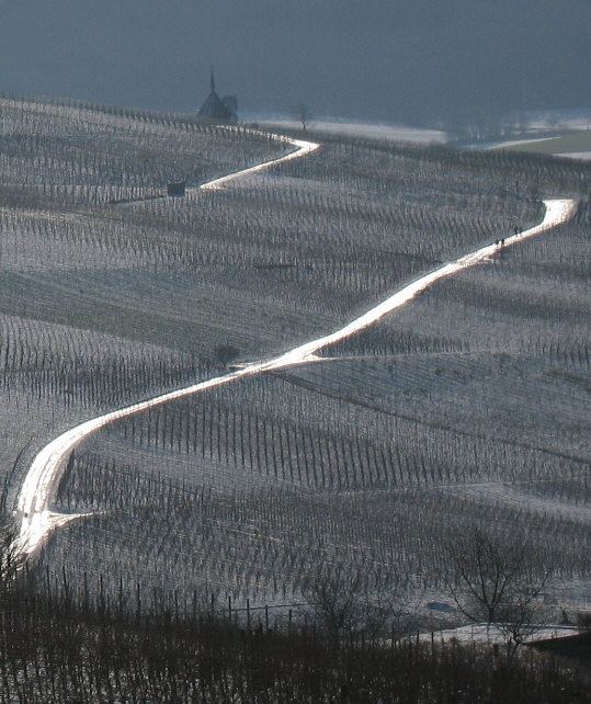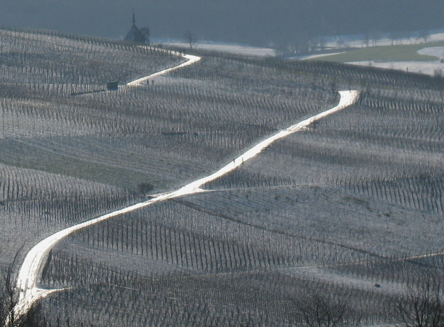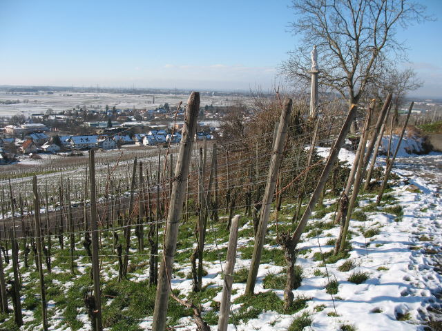 Blick nach Nordosten über Pfaffenweiler-Kirche zu Batzenberg und Kaiserstuhl am 28.1.2007 Blick nach Nordosten über Pfaffenweiler-Kirche zu Batzenberg und Kaiserstuhl am 18.2.2005 Blaue Farbbeutel auch auf dem Weg zum Kirchberg vor dem Kreuz am 28.1.2007
