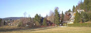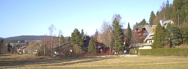 Foto: Blick Anfang März 2002 vom Kessler Hang nach Norden auf Hinterzarten. Links der Zwiebelturm der alten Kirche im Dorfmittelpunkt von Hinterzarten. Das erste, helle Haus ganz rechts ist die VillaMed.