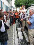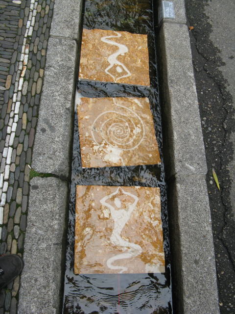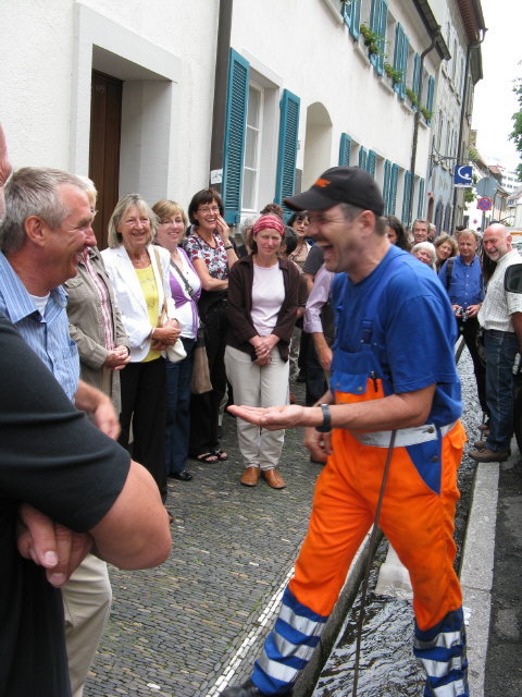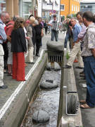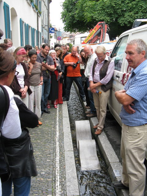 Als die Bächlekünstler bei ihrem Bächlerundgang nach der Bächleausstellungseröffnung so gegen 13 Uhr bei der Bächlewelle von Wolfgang Jakob ankommen, treffen sie auf einen echt-leibhaftigen Bächleputzer, der am Bächle seine Bächlearbeit verrichtet. Und schon kommen sich die sonst doch "Berufsgruppen" wie Künstler und Reinigungspersonal näher. Ganz unverhofft lieget einige Cent (oder warens gar Euros) in der Hand des Bächleputzers. Der Künstler: "Fürs Putzen der Kunst im Bächle". Der Bächleputzer: "Für die steinerne schwere Bächlewelle ist mein Besen doch zu schwach". Und alle lachen - Kunst verbindet."