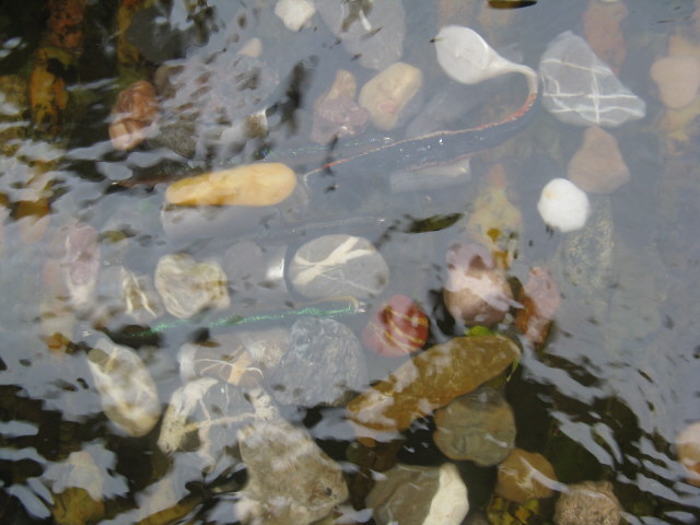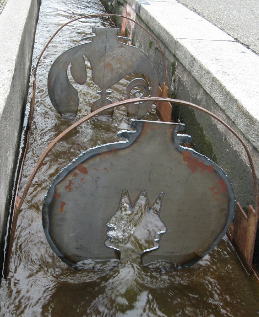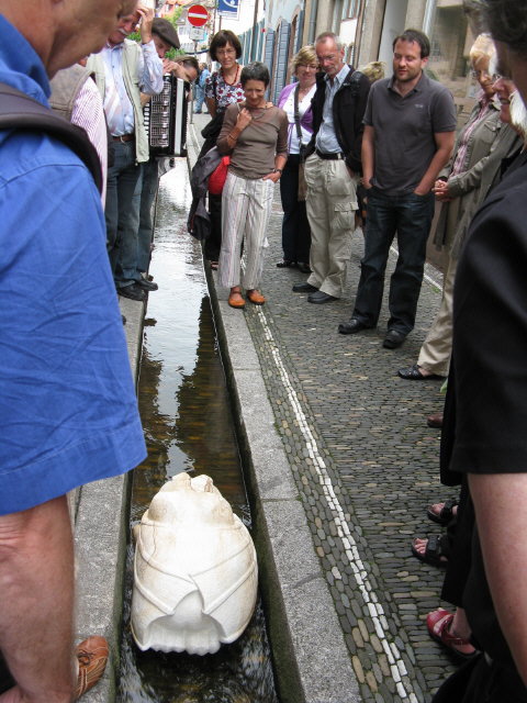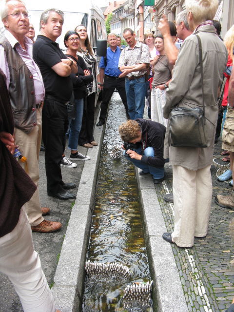 "Was machen Sie denn da unten am Boden?" fragt mich Albrecht Hipp, Wirt vom Gasthaus zum Kranz, als ich am Bächle vor seinem Gasthaus am Boden in die Knie gehe, um den Fisch zu fotografieren, der da im Wasser zwischen beiden eisernen Kunstobjekten von Sabine Herrschaft schwimmt. Und erst jetzt entdeckt auch er, dass es Fische gibt vor seinem Lokal.