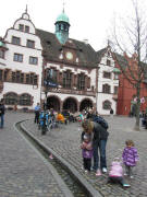 Samstagvormittag am 26.3.2011 am Freiburger Rathausplatz: Zwei Zwillingsmädchen (in hellrot) wollen ihre neuen Segelboote (ebenfalls in hellrot) zu Wasser lassen und ausprobieren - für zahlreiche Passanten interessanter als die Infostände der Parteien zur anstehenden Landtagswahl ringsum.