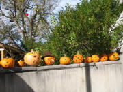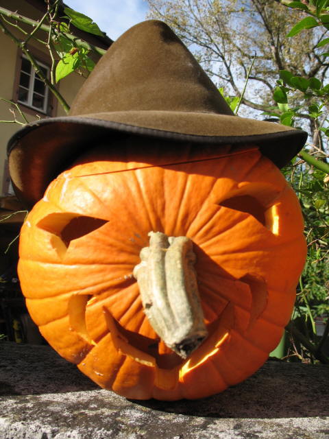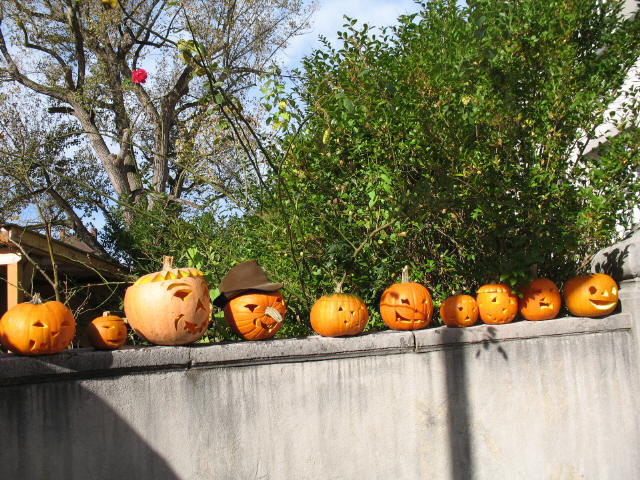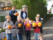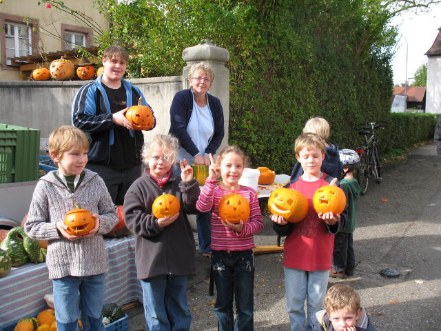 Auch in diesem Jahr: Unter der Regie von Jeane Fünfgeld wurde aus Kürbissen lustige Gesichter geschnitzt. Bei 20 Grad und Sonnenschein. Die Kürbisse kamen aus Wasenweiler - vom Gemüsestand von Frau Rudmann nebenan.