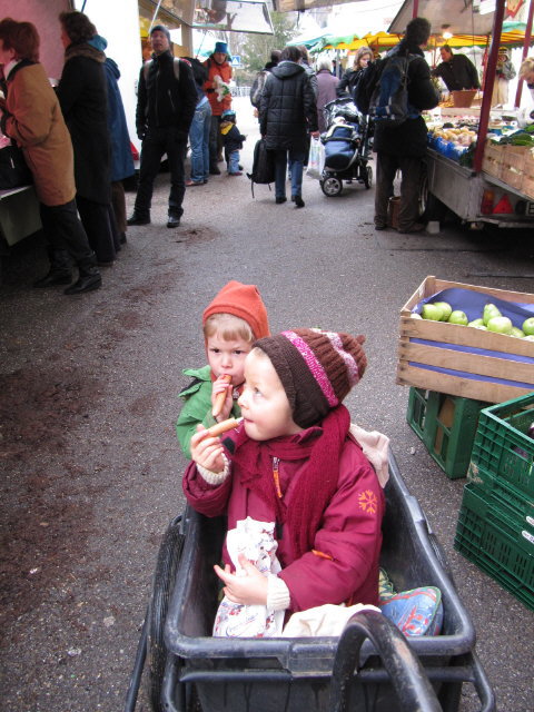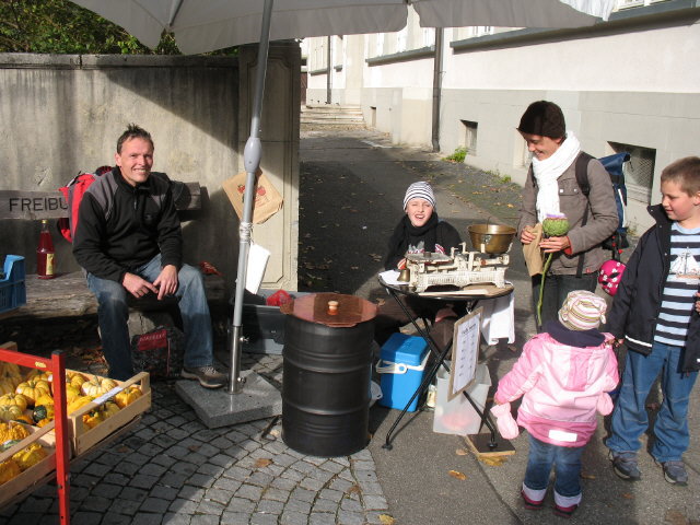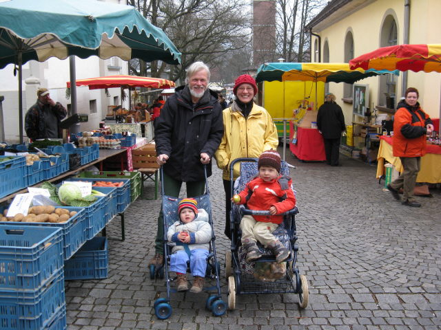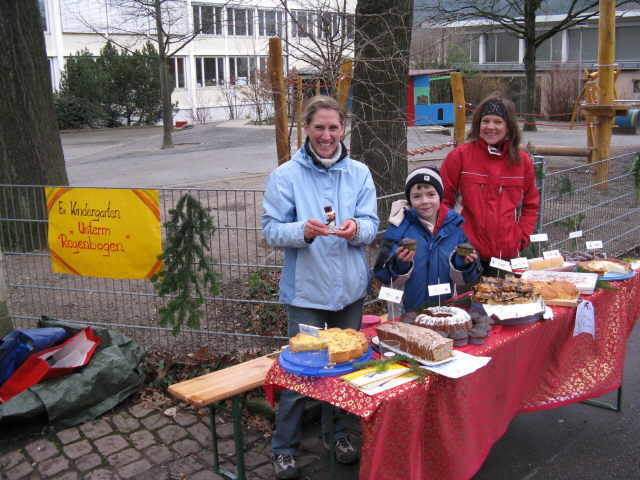Regenbogen-Kuchenstand auf dem Littenweiler Bauernmarkt am 6.12.2008 bei kaltem Wind und viel Regen: Eva Franz, Jannik und Astrid Schaffert Würstle essen auf dem Bauernmarkt in Freiburg-Littenweiler am 20.2.2010 Frau Isele am Stand der Kinderkrebs-Hilfe am 26.3.2011