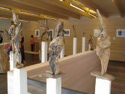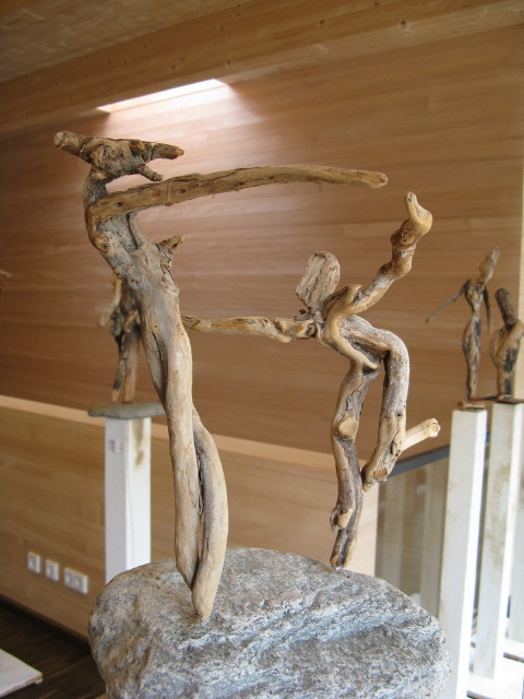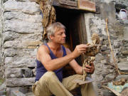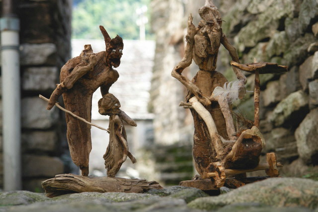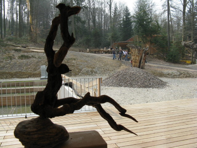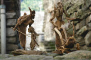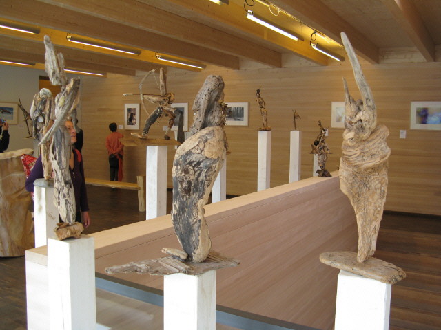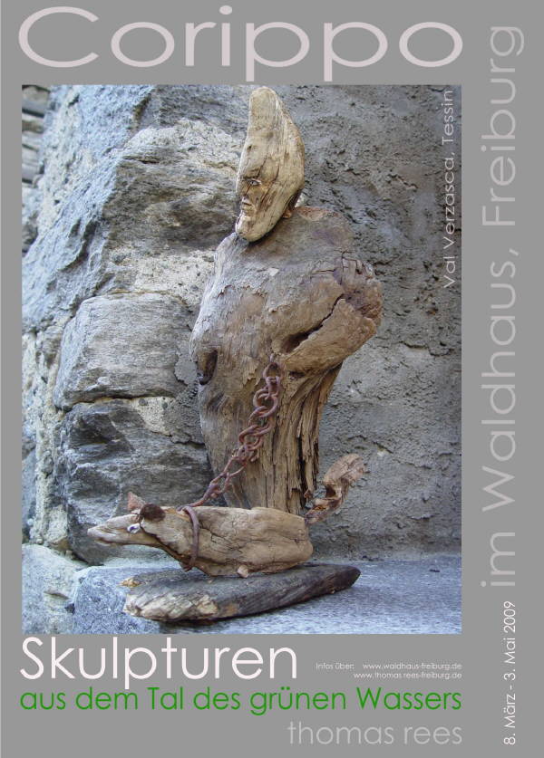 Skulpturen - aus dem Tal des grünen Wassers - zu sehen im Waldhaus Freiburg Diese Ausstellung - zu sehen im Waldhaus Freiburg - ist der kleinsten Gemeinde der Schweiz gewidmet: Corippo Corippo, mit 17 Einwohnern (im Jahr 2005), liegt auf der Sonnenseite der Schweiz im Kanton Tessin. Die smaragdgrüne Farbe des Gebirgsflusses gab dem Tal seinen Namen: Val Verzasca, das “ Tal des grünen Wassers“. Corippo ist ein Ort mit einer bezaubernden Ursprünglichkeit, in dem die Zeit still zu stehen scheint. Am Berg über der tiefen Schlucht klebend, holprige Wege, enge Gassen, steile Stufen, halbwilde Katzen. Ein versteinerter Ort - vor Jahrhunderten aus Granit gebaut. Mauern, Dächer, Wege, Stufen in Harmonie mit Felswänden, Schluchten und Bergen. Grautöne in verschiedensten Facetten, bestimmt von Licht und Schatten, Sonne und Regen, lassen den Rest der Welt nach einer gewissen Zeit viel zu bunt und schrill erscheinen. Umgeben von einer wilden, gnadenlosen Natur, die sich von Menschenhand mühsam kultiviertes Land wieder zurückholt. Die Menschen sind zu alt, die Arbeit ist zu schwer und die Jungen sind fort. Bäume und Wurzelwerk sprengen tonnenschwere Mauern und Dächer - Farne und Moose überdecken die Reste. Wege und Häuser verschwinden. Dank Menschen mit Visionen, Tatkraft und Idealismus blieb Corippo dieses Schicksal bisher erspart. Ein kleines Stück Gegenwelt blieb so authentisch, spürbar, sichtbar und erlebbar. Mit meiner Frau Michaela und unseren Töchtern Sarah und Tabea habe ich dort viele glückliche Wochen über Jahre hinweg verbracht und einen kleinen Abschnitt Geschichte, mit Glück und Freude aber auch Trauer und Schmerz miterlebt. Diese Ausstellung zeigt Skulpturen, die dort entstanden sind. Geschaffen aus kleinen, auf den ersten Blick unscheinbaren hölzernen Fundstücken. Stücke, deren Form und Farbe gezeichnet sind von Sonne, Wasser und der Zeit mit ihren Veränderungen - gezeichnet wie das Land und die Menschen. Zwei Künstler faszinieren: Klaus Echle und Thomas Rees >Waldhaus (4.3.2009)