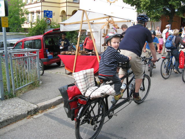 (8) Felicitas zeigt wie man es macht - lange Schlange interessierter Kinder am 18.7.2009 (9) Geniale Konstruktion: Auch der stolze Tandem-Junior kann treten