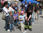(7-8) Felicitas Zanger von der Jugendfeuerwehr Ebnet hatte DIE Idee: Ein großes Gesicht aus Styropor aussägen und rot anmalen. Kinder spritzen gezielt auf den Mund, nach 1 min wird die gesammelte Wassermenge gemessen und belohnt. Eine lange Schlange begeisterter Kinder bewies, dass Feuerwehrarbeit schon in jüngsten Jahren interessiert.