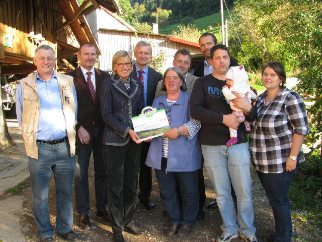 In Anwesenheit von Landrätin Dorothea Störr-Ritter, dem Geschäftsführer der Erzeugergemeinschaft „echt Schwarzwald“ Klaus Binder, dem Geschäftsführer des Naturparks Südschwarzwald Roland Schöttle sowie dem Bürgermeister der Gemeinde Stegen Siegfried Kuster wurde der Familie Schuler vom Domilishof in Stegen-Eschbach das Zertifikat „echt Schwarzwald“ für seine Rindfleischproduktion überreicht. Der Domilishof von Familie Schuler ist ein innovativer Landwirtschaftsbetrieb im Landkreis Breisgau-Hochschwarzwald. Familie Schuler produziert in Mutterkuhhaltung nach den Regeln der Erzeugergemeinschaft „echt Schwarzwald“, die Ende 2007 in der Ortenau ins Leben gerufen wurde. „Es ist für uns eine Herzenssache, gesundes und geschmackvolles Fleisch zu erzeugen. „Echt Schwarzwald“ ist für uns dabei der ideale Vermarktungspartner“, resümierte der Hofbesitzer Bernhard Schuler. Die Erzeugerrichtlinien sehen vor, dass alle Tiere im Naturpark Südschwarzwald oder Schwarzwald Mitte/Nord geboren und aufgewachsen sein müssen. Außerdem muss das Futter für die rund 20 Tiere auf dem Domilishof regional und gentechnikfrei erzeugt werden. Landrätin Dorothea Störr-Ritter unterstrich die Bedeutung der Qualitätsmarke für die regionale Landwirtschaft. Damit werde ein großer Kreis von Konsumenten angesprochen werden, der Wert auf Gesundheit und Nachhaltigkeit lege. Sie gratulierte der Familie Schuler, hierbei als Protagonist tätig zu sein und dankte dem Naturpark Südschwarzwald, dass er als treibende Kraft in der Regionalentwicklung die Verbreitung von „echt Schwarzwald“ so tatkräftig unterstützt. "Die Identität von Erzeugungsort und Lebensraum, die Identität von Produktionsraum und Urlaubsregion schafft beim Kauf von regionalen Lebensmitteln Vertrauen bei Bewohnern und Besuchern des Schwarzwaldes. Diese Nähe zum Verbraucher bietet gleichzeitig beste Chancen beim Absatz von Spitzenqualitäten regionaler Produkte", so Störr-Ritter. Roland Schöttle, Geschäftsführer des Naturparks Südschwarzwald, sieht in der Qualitätsmarke „echt Schwarzwald“ eine reale Chance, die traditionelle Landwirtschaft und damit auch die charakteristische Vielfalt der Landschaft im Südschwarzwald zu erhalten. So passe die mit „echt Schwarzwald“ geschaffene Wertschöpfungskette von Landwirt - Metzger - Gastwirt genau in dieses Konzept, zu dem bereits die Naturpark-Märkte, der Brunch auf dem Bauernhof, die Käseroute und die Naturparkwirte gehören. Ziel sei es, Nähe zum Verbraucher zu schaffen und die Besiedlung des ländlichen Raumes zu erhalten. Klaus Binder, Geschäftsführer der Erzeugergemeinschaft „echt Schwarzwald“, freute sich, dass mit dem Domilishof ein „Top-Betrieb“ hinzugekommen sei. Binder hat mit seinem Engagement bereits – in nur 3 Jahren – an die 120 Schwarzwälder Erzeugerbetriebe für Rinder, Ziegen, Schafe, Schweine, Honig, Milch und Edelbrände sowie zehn Metzgereien unter dem Prädikat „echt Schwarzwald“ vereinigen können und hofft, dass sich noch viele weitere anschließen werden. Der Bürgermeister der Gemeinde Stegen, Siegfried Kuster, hob vor allem die Bedeutung der Landwirtschaft für die Offenhaltung der Täler hervor. „Nur wenige Kilometer vom ebenen Dreisamtal entfernt, sind wir hier in Eschbach besonders darauf angewiesen, dass unsere Landwirte die extremen Steillagen auch zukünftig bewirtschaften und dadurch dazu beitragen, dass die Lebensqualität einer offenen Tallandschaft erhalten bleibt.“