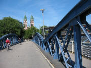 Blick nach Westen von der Blauen Brücke zu Mobile und Stühlinger Kirche am 1.8.2007