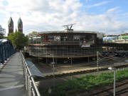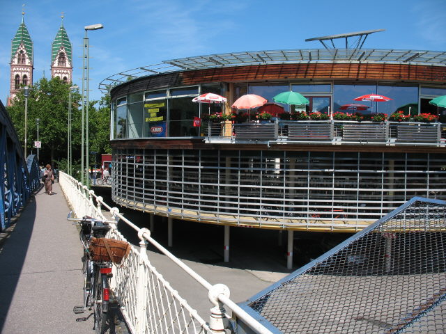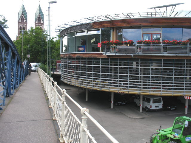 Blick nach Westen von der Blauen Brücke zu Mobile und Stühlinger Kirche am 12.7.2007 Ein Lichtblick: Fahrrad-Rondell links neben der Stühlinger-Brücke