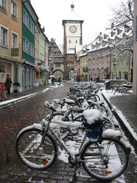 elo groß und Velo klein am Bächle - beide gut abgeschlossen am 12.9.2009 Fahrrad-Trio am 14.11.2009# Blick nach Osten am Holzmarktplatz zum Goethegymnasium am 26.12.2009: Rikschafahrrad parkt