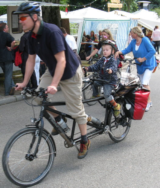Zweiradstadt auch in der Fußgängerzone am Rathaus: Moped, Velo und "im Bächle radeln" am 15.8.2007 Geniale Konstruktion: Auch der stolze Tandem-Junior kann treten