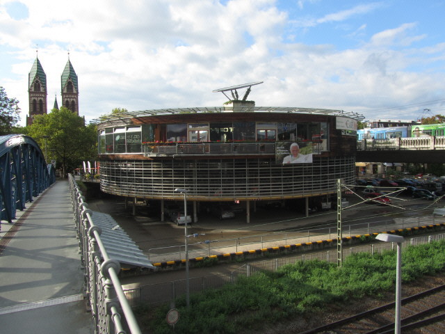 Blick nach Westen von der Blauen Brücke zu Mobile und Stühlinger Kirche am 12.7.2007 Fahrräder codieren am Karsamstag 2002 auf dem Littenweiler Bauernmarkt Mobile links von der Überführung zum Stühlinger am Freiburger Hauptbahnhof