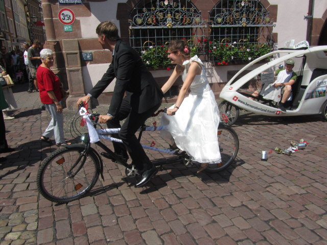 Zweiradstadt auch in der Fußgängerzone am Rathaus: Moped, Velo und im Bächle radeln am 15.8.2007 Geniale Konstruktion: Auch der stolze Tandem-Junior kann treten Hochzeitskutsche in der Kartäuserstrasse am 12.9.2009
